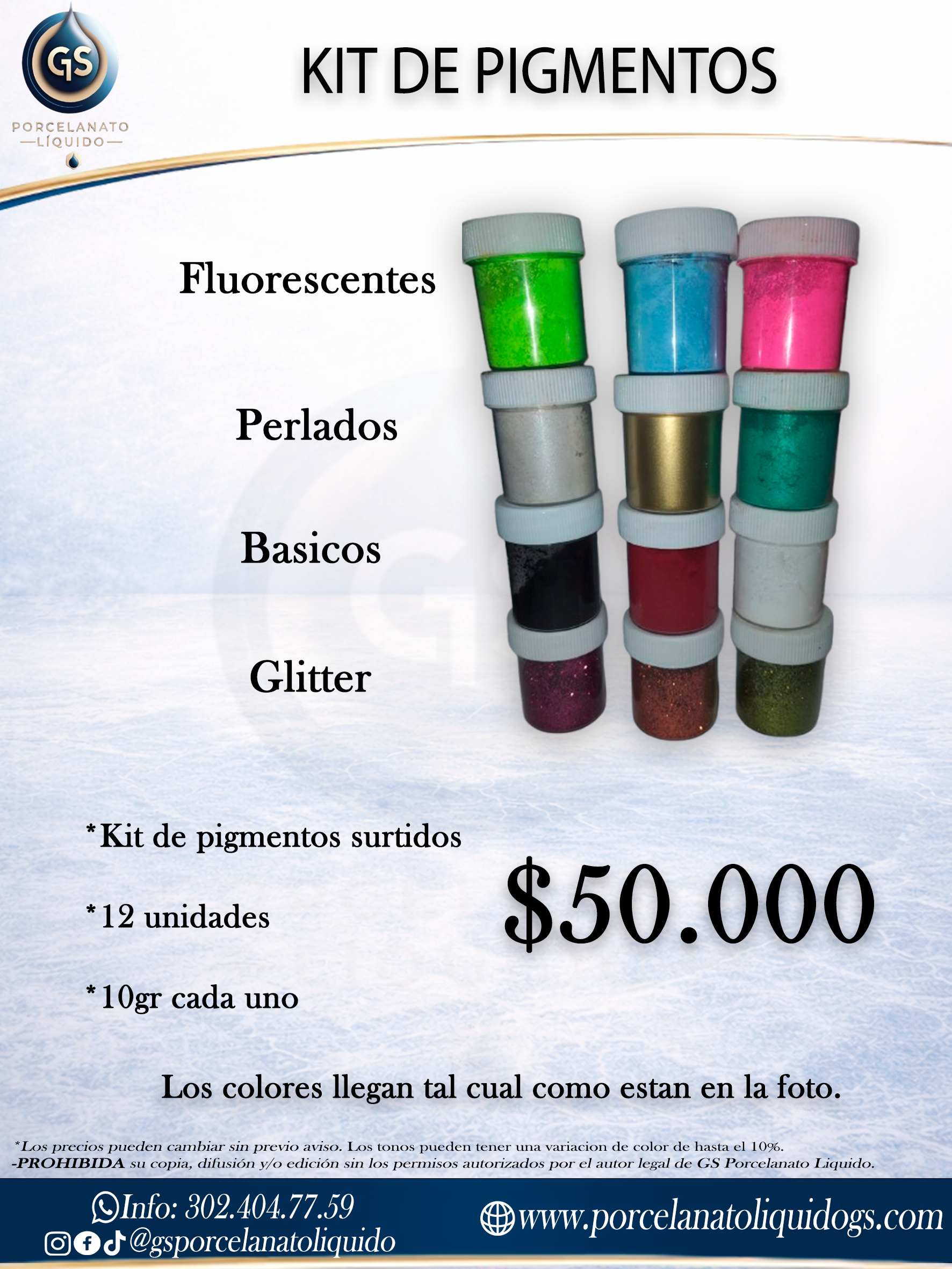 ¡Lleva tu creatividad al máximo con el Kit de Pigmentos Profesional de GS Porcelanato Líquido! Este set exclusivo ha sido diseñado para ofrecerte una muestra completa de todos los efectos que puedes lograr en tus proyectos de resina epóxica.
