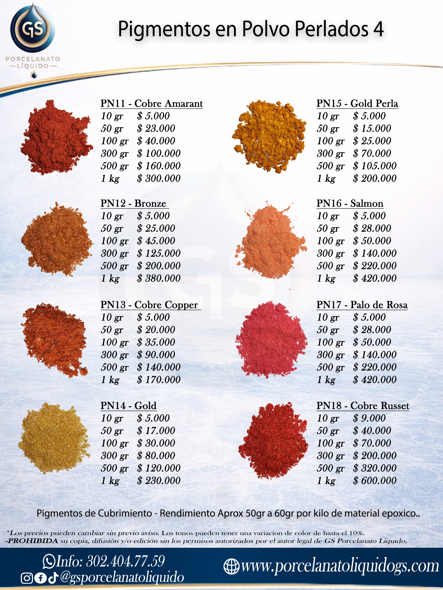 Pigmentos Perlados 4. Los pigmentos perlados de GS ofrecen un acabado de alta calidad. Estos polvos están diseñados para artistas que buscan elegancia. Su estructura mineral permite reflejos de luz muy profundos. Esto crea un efecto de nácar natural en cada pieza. El brillo que aportan es suave y muy profesional. Es la solución ideal para transformar superficies en piezas de lujo.
